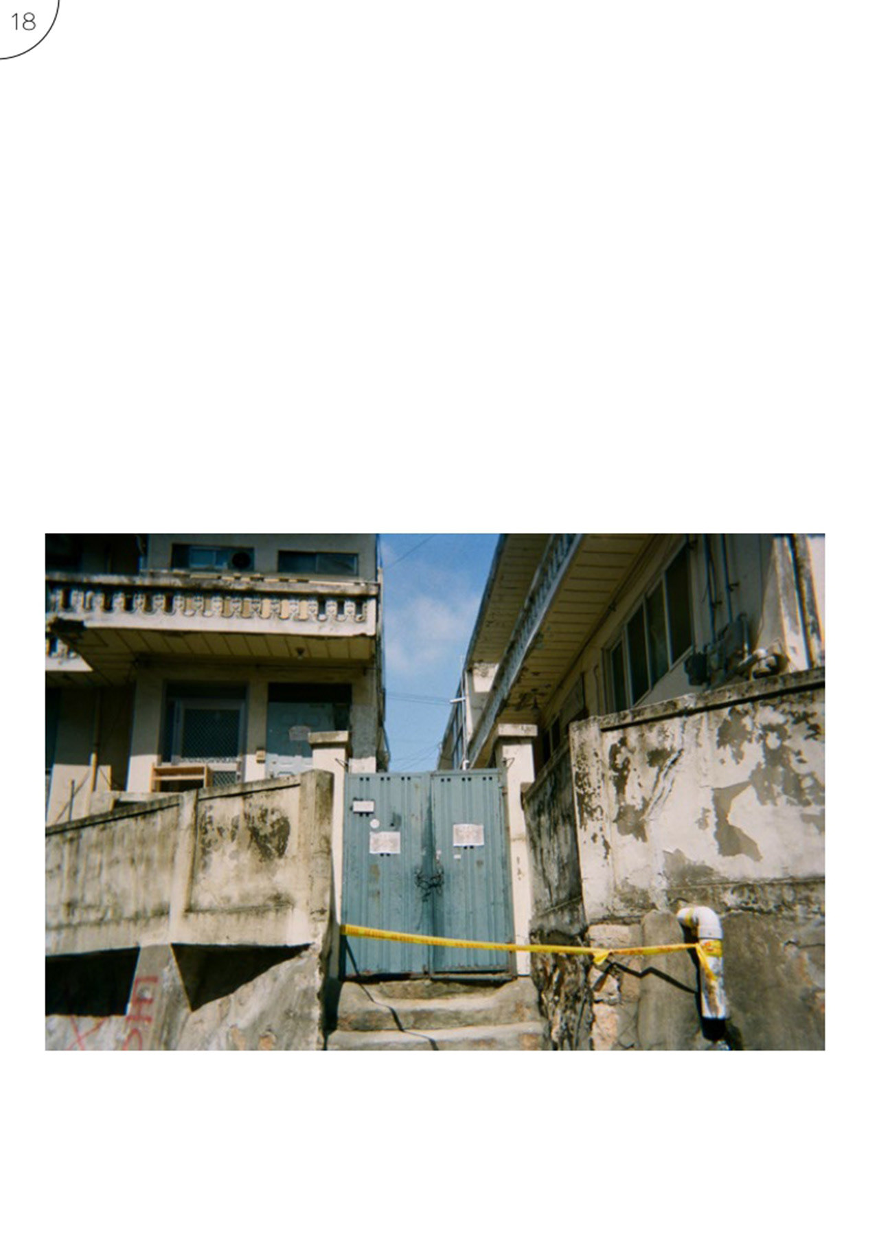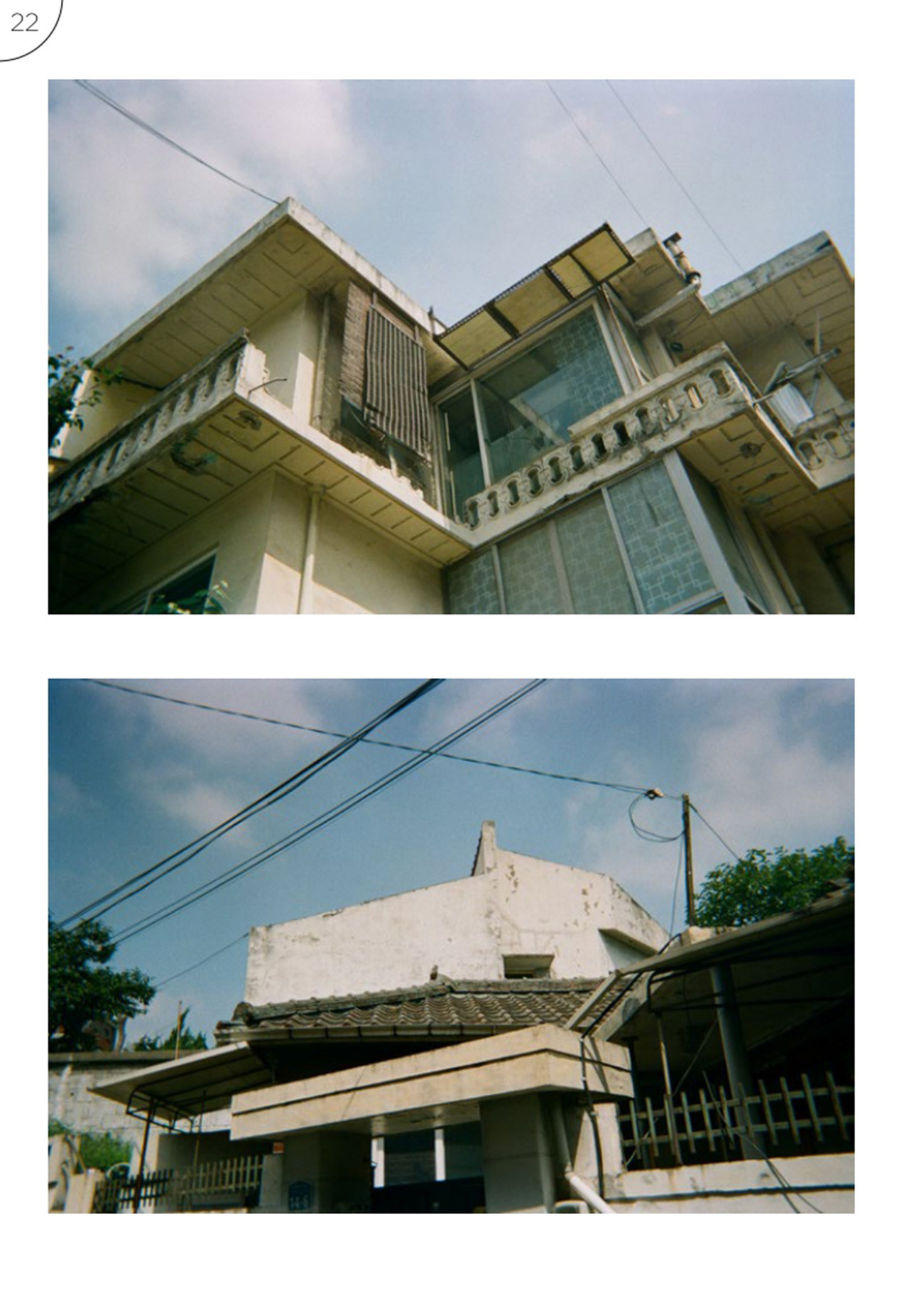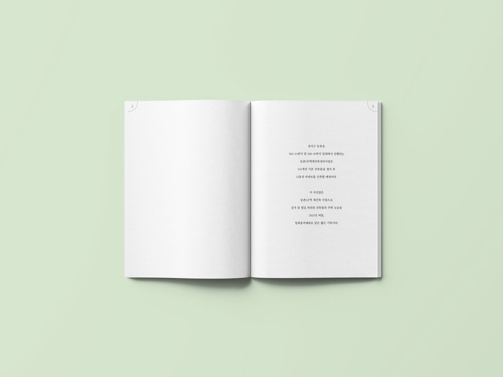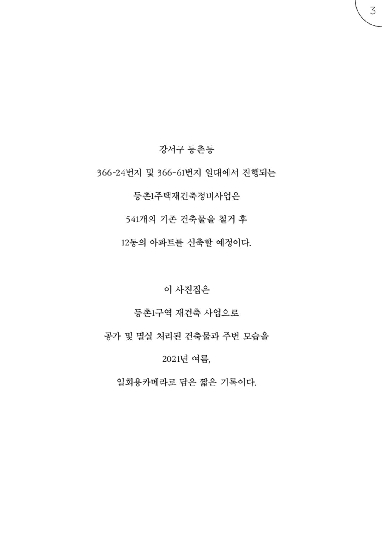 강서구 등촌동 366-24번지 및 366-61번지 일대에서 진행되는 등촌1주택재건축정비사업은 541개의 기존 건축물을 철거 후 12동의 아파트를 신축할 예정이다. 이 사진집은 등촌1구역 재건축 사업으로 공가 및 멸실 처리된 건축물과 주변 모습을 2021년 여름 동안, 일회용카메라로 담은 짧은 기록이다.